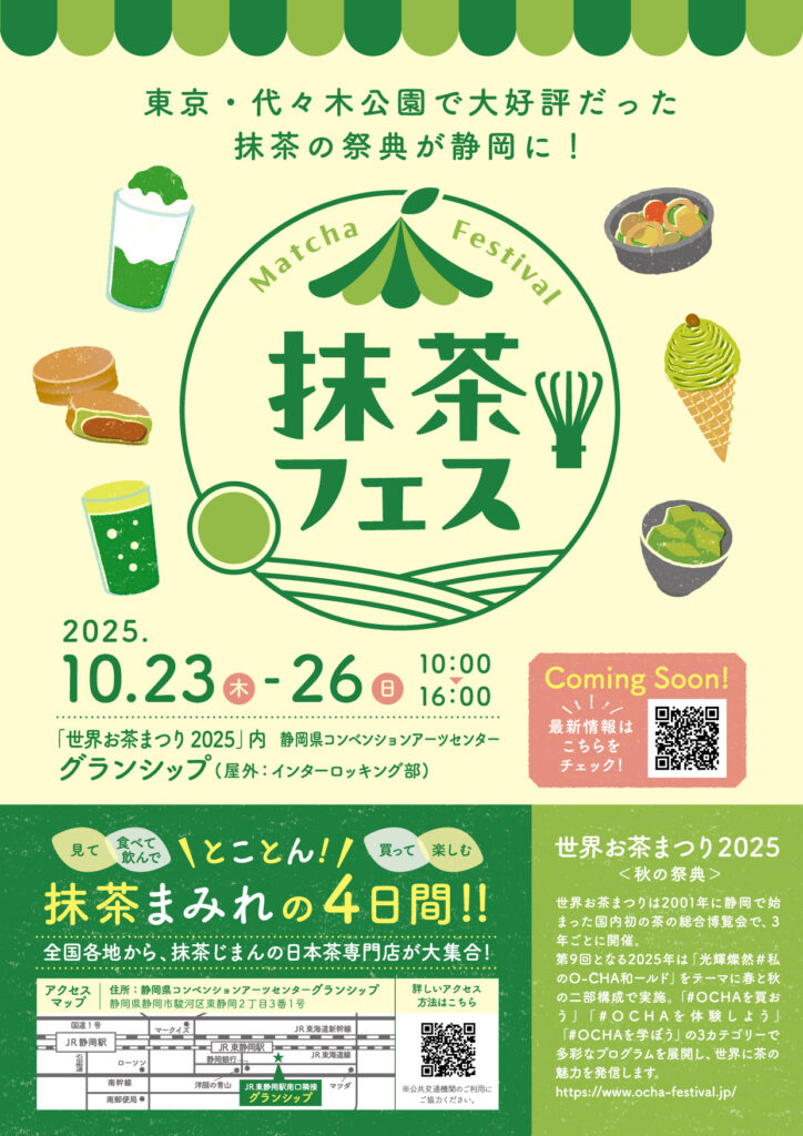 10月23日(木)~26日(日)の4日間 静岡県にあるグランシップにて開催の「世界お茶まつり2025 秋の祭典」にて 抹茶フェスを開催いたします!! 抹茶フェス? おいしい抹茶のフード、スイーツ、ドリンクをもっともっと知って堪能していただきたい! 抹茶をおうちで飲む機会も増やしてほしい! そんな思いで、お茶の祭典、世界お茶まつりの会場にて「抹茶フェス」を開催いたします。 選りすぐりの6店舗が集結し、 店舗に行かないと食べられないメニューや、 普段は提供していない抹茶フェス限定メニューなど目白押し! そこへ茶雑菓も出店させていただきます★ 会場の抹茶フェスブース前には大きな芝生の広場もあり、 秋の風を感じていただきながらのんびりお過ごしいただけるかと思います。 ご来場をお待ちしております♪![]()